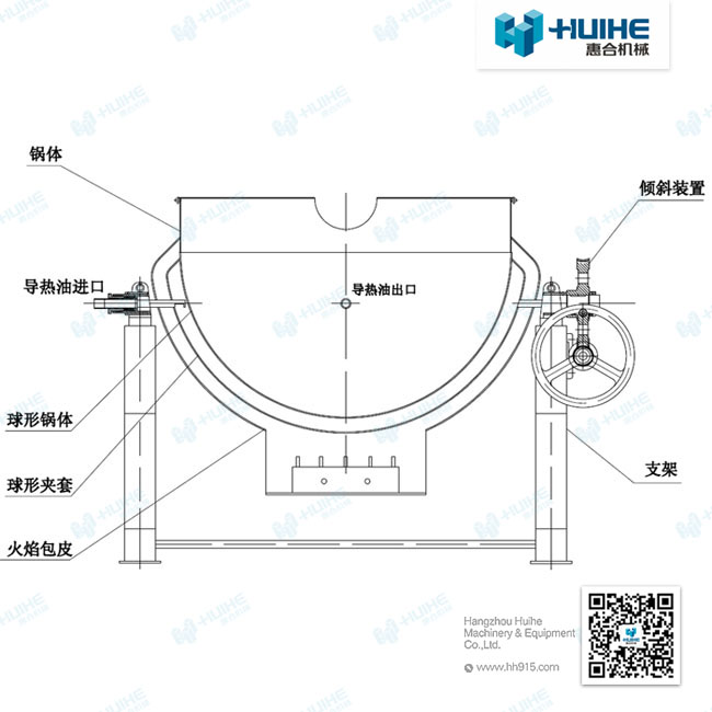 可傾式電加熱夾層鍋主要是由半球形罐、支架、翻轉裝置、攪拌裝置等部分組成